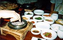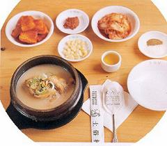 韓国の夏ばて防止の定番料理だそうだ。若鳥の中にご飯を詰め、よく似たものである。この中には高麗人参など30余種類の薬材も入っており薬膳料理である。 高麗人参はよく煮てあり柔らかいが、やはり苦い。 この料理の味は薄味であり、一緒についてくる小皿の野菜と共に食べるとおいしくいただける。 米は、日本のものとは違い、もち米っぽい感じがした。 土俗村参鶏湯で食す。 |