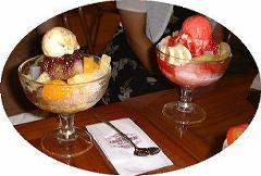 かき氷にアイスクリーム、果物、アン等がのっているもの。いちごやキウィにまじり、プチトマトも・・・・・。でも、ちょっとトマトは合わなかったなあ。 夏ならではのもの、なんといっても4000ウォン(400円) |